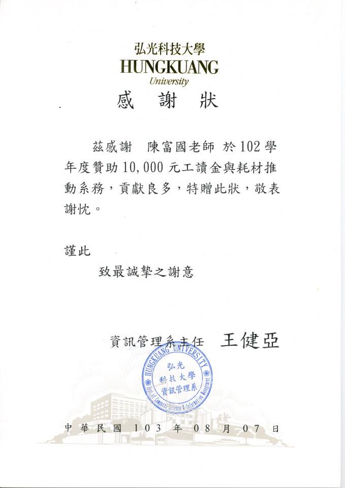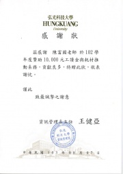 | 2014年9月2日 (二) 02:56 | 102弘光科技大學 贊助感謝狀.jpg (檔案) | 40 KB | Ching | 1 | ||