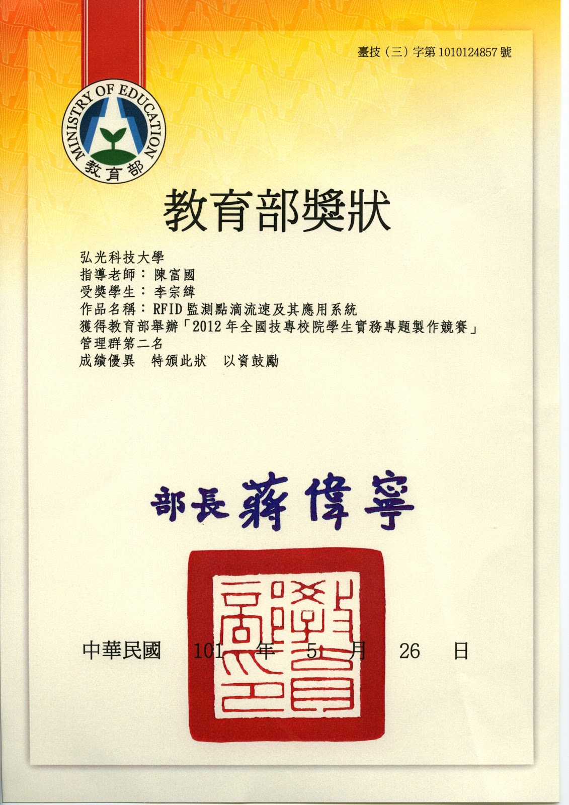 | 2013年6月24日 (一) 09:55 | 001 教育部2012全國技專校院學生實務專題製作競賽第二名獎狀.jpg (檔案) | 341 KB | 1 | ||